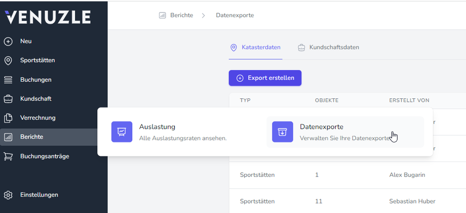 Im Venuzle Manager gibt es eine Vielzahl von Datenexport-Möglichkeiten. Man geht dafür unter Berichte - Datenexporte.