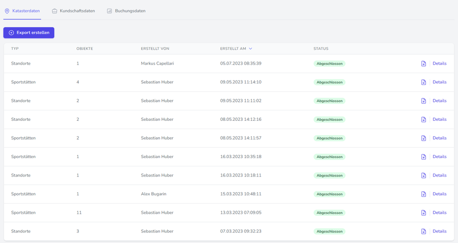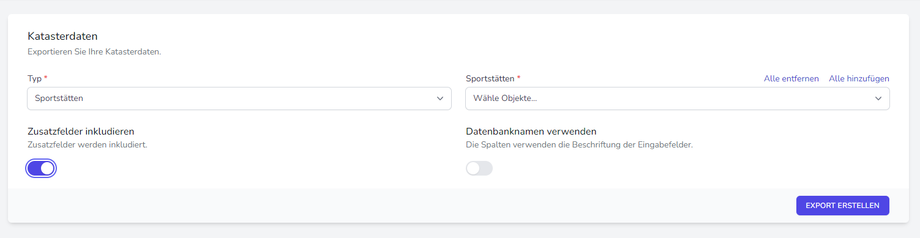 Unter dem Reiter "Katasterdaten" können die Daten der Standorte und der Sportstätten exportiert werden. Man klickt dafür einfach auf "Export erstellen".