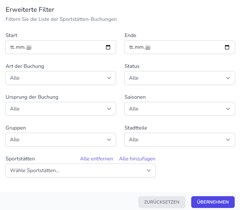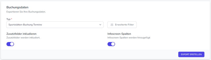 In gleicher Prozedur können auch Buchungsdetails exportiert werden. Dabei kann man mithilfe von Filtern bestimmen, welche Buchungen exportiert werden sollen. Sofern diese vorhanden sind, können Zusatzfelder und/oder Infoscreen Details der jeweiligen Buchungen in den Datenexport inkludiert werden.