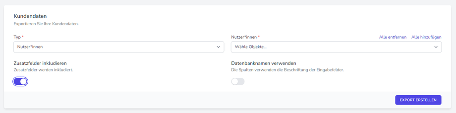 Die gleiche Möglichkeit gibt es unter dem Reiter "Kundschaftsdaten", um sich die Daten der Kunden zu exportieren. Man wählt, ob man Nutzer*innen oder Organisationen exportieren möchte. Dann wählt man noch aus, welche Nutzer*innen bzw. Organisationen im Export inkludiert werden und ob Zusatzfelder im Export angezeigt werden sollen. Mit einem Klick auf "Export erstellen", wird eine Excel Datei mit den Daten generiert.