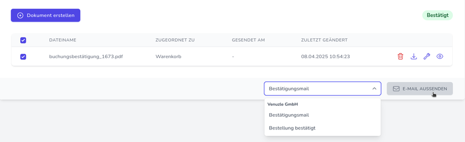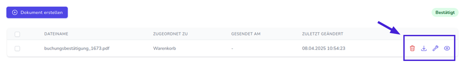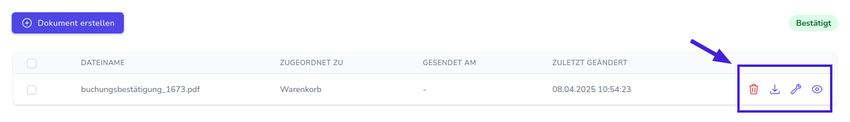Daraufhin wird das erstellte Dokument in der Dokumentenliste angezeigt. Nun hat man folgende vier Möglichkeiten: