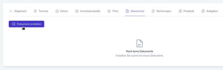 Um ein Dokument zu erstellen oder anzuhängen, navigiert man in der betreffenden Buchung zum Reiter "Dokumente" und klickt auf den Button "Dokument erstellen".