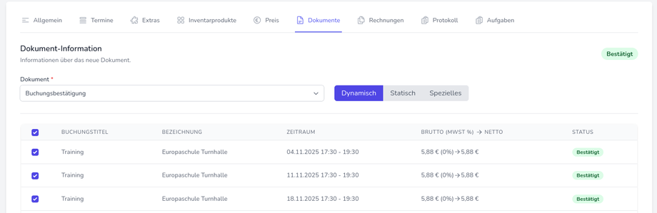 Automatisch werden anschließend alle Termine der Buchung angeführt, von welchen man noch einzelne für die Dokumenten-Generierung an- oder abwählen kann.