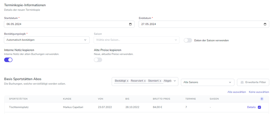 Im Bereich Einstellungen > Terminkopien finden Sie eine Übersicht aller erstellten Terminkopien und können zudem neue Terminkopien erstellen.