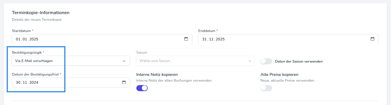 Für das Erstellen einer Terminkopie müssen folgende Daten angegeben werden: