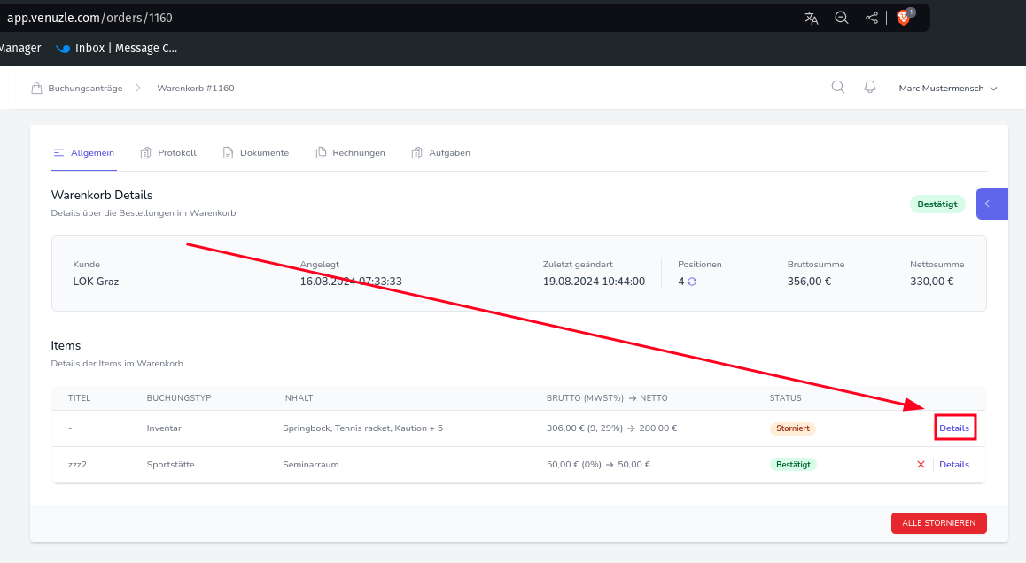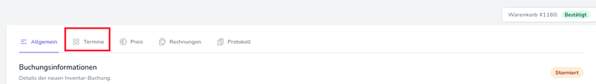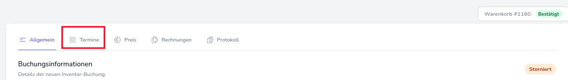 Dort angekommen, suchen Sie sich das Item aus, das in der Rechnung nachbearbeitet werden soll und klicken auf Details. Sie werden zur Ansicht der Buchungsinformationen weitergeleitet und müssen von dort auf den Termine Reiter klicken.