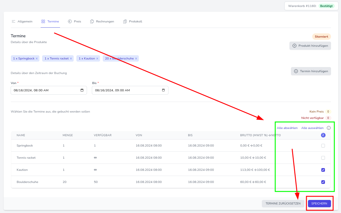 Hier können Sie aussuchen, welche der Gegenstände für die Rechnung berücksichtigt werden sollen, mit einem Klick können Sie aber auch alle aus- oder abwählen. Wenn Sie mit Ihrer Auswahl fertig sind, müssen die Änderungen nurnoch gespeichert werden.