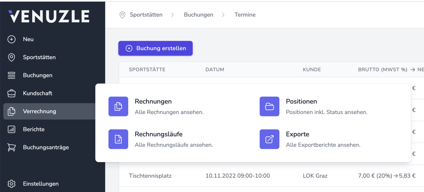 Um Rechnungen für die eingetragenen Buchungen im Manager zu generien, gibt es den Menüpunkt "Verrechnung" im Hauptmenü.