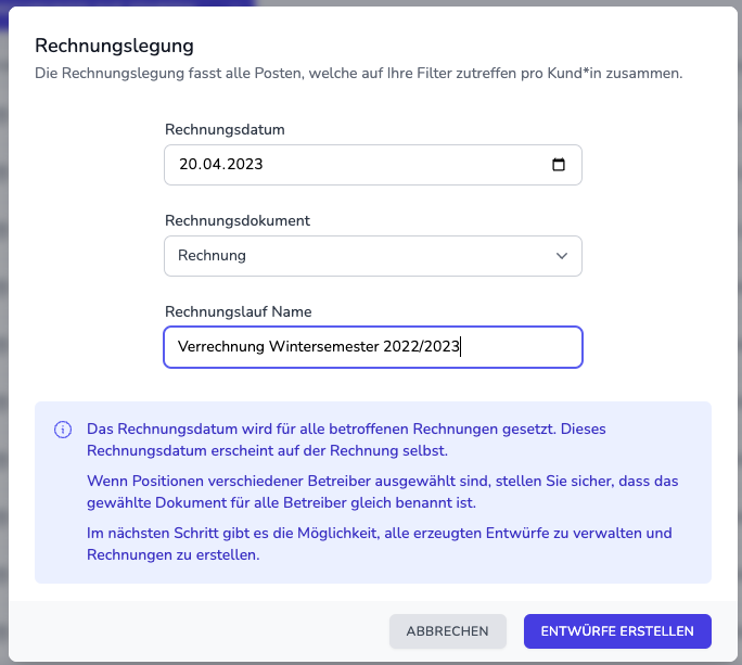 Wenn man nun einen neuen Rechnungslauf startet, bekommt man die Möglichkeit, das Rechnungsdatum einzutragen sowie die Rechnungsvorlage und auch eine Bezeichnung für den gestarteten Rechnungslauf auszuwählen. Danach klickt man auf "Entwürfe erstellen", um mit der Verrechnung fortzufahren.
