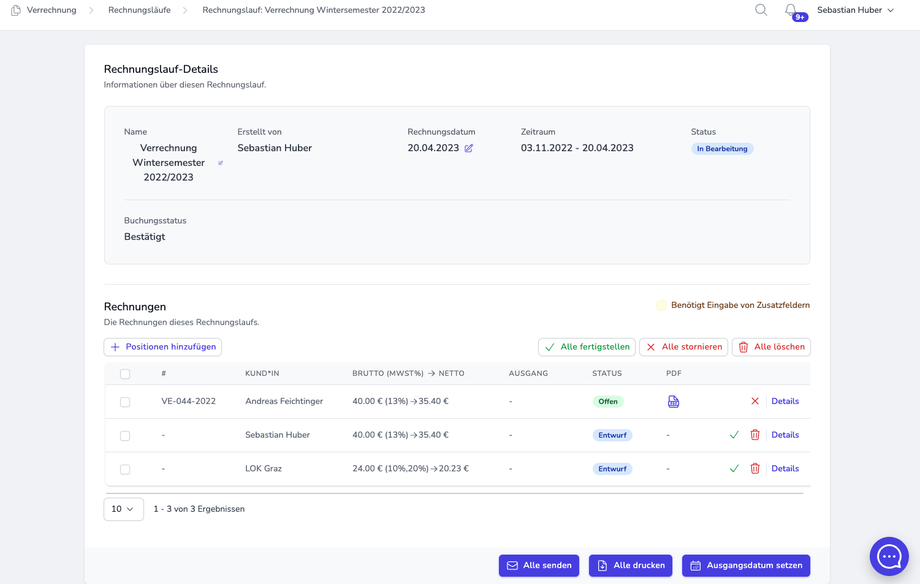 Im nächsten Schritt sind die Rechnungen nun bereits als Entwurf erstellt und können nochmals überprüft werden. Sollten Positionen beim Rechnungslauf fehlen, können diese auch nachträglich über "Positionen hinzufügen" aus dieser Ansicht heraus ergänzt werden. Sollte man mit dem Entwurf zufrieden sein, kann man die Entwürfe fertigstellen und in eine Rechnung inkl. PDF-Dokument umwandeln. Fertiggestellte Rechnungen bekommen dann den Status "Offen", erhalten eine fortlaufende Rechnungsnummer und können daraufhin nur noch storniert werden. Entwürfe können im Vergleich dazu auch komplett gelöscht werden. In beiden Fällen wandern die Positionen dann wieder in die Übersicht der unverrechneten Positionen.