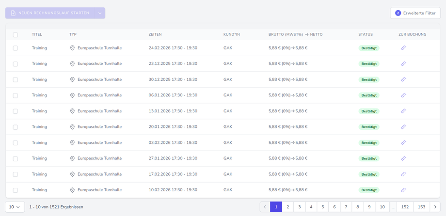 Beim Klick auf Positionen erscheinen alle verrechenbaren Positionen (Termine mit dem Buchungs-Status "Bestätigt"). Mithilfe der "Erweiterten Filter" am recht oberen Rand können die Abrechnungsposten noch weiter eingeschränkt werden, um z.B. nur einen gewissen Zeitraum, einzelne Kundengruppen oder Sportstätten abzurechnen. Über das kleine Link-Symbol gelangt man direkt zur verknüpften Buchung. Durch das Anhaken der Positionen können diese mithilfe der Funktion "Neuen Rechnungslauf starten" abgerechnet werden. Wenn man auf den Auswahl-Dropdown daneben klickt, bekommt man zudem die Möglichkeit, die Positionen zu einem bestehenden Rechnungsentwurf oder einem bestehenden Rechnungslauf (als neue Rechnung) hinzuzufügen.