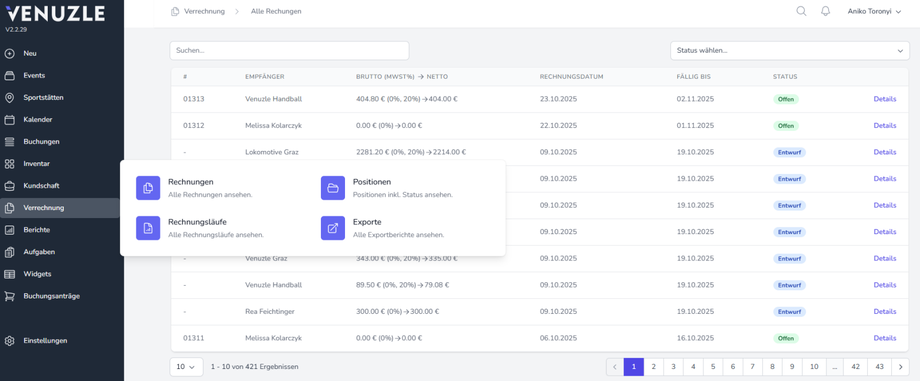 Unter dem Menüpunkt Verrechnung → Rechnungen sind sämtliche bereits erstellten Rechnungen aufgelistet.