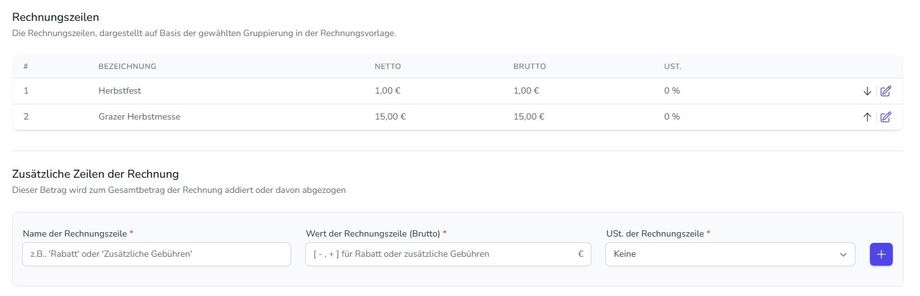 Bei einem Entwurf können hier die bereits vorhandenen Rechnungszeilen bearbeitet oder zusätzliche Zeilen hinzugefügt werden.