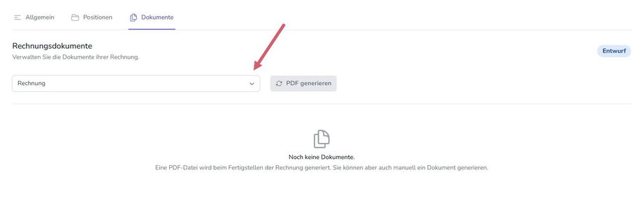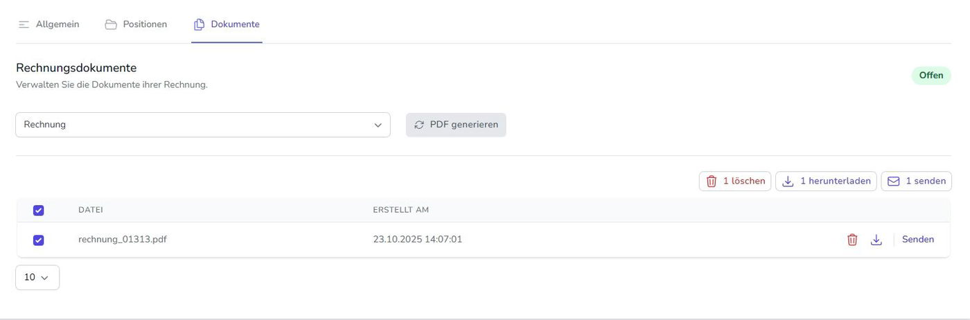 Unter dem Reiter „Dokumente“ können neue PDF-Dokumente generiert oder bereits vorhandene Dokumente der Rechnung verwaltet werden. Um ein neues Dokument zu erstellen, wählen Sie eine Vorlage aus der Dropdown-Liste aus und klicken Sie auf den Button „PDF generieren“. Die Vorlagen müssen zuvor erstellt worden sein.
