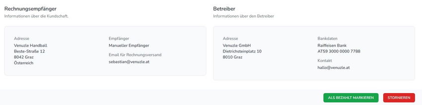 Unterhalb der Liste der Rechnungszeilen befinden sich die Daten des Rechnungsempfängers sowie des Betreibers.