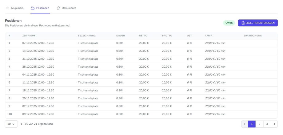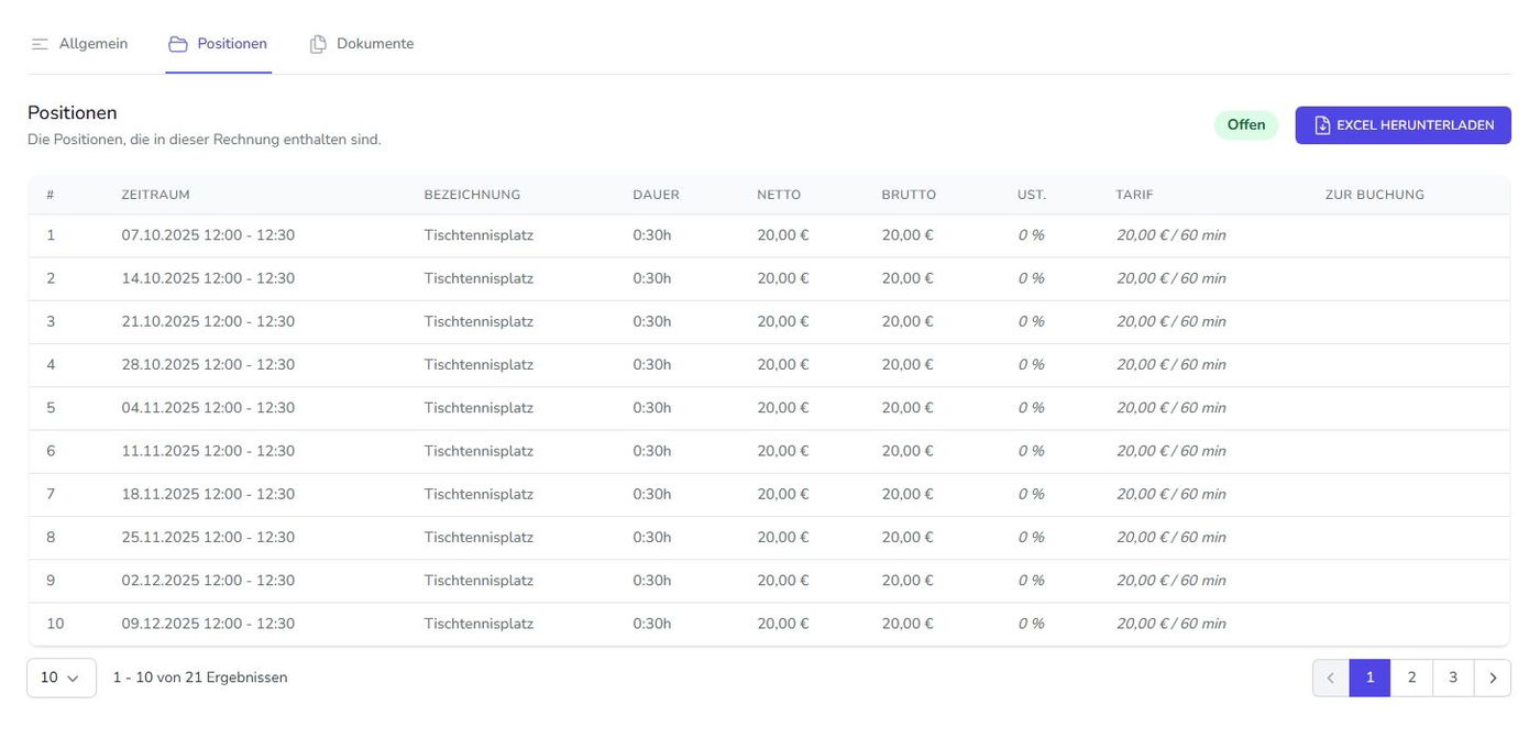 Unter dem Reiter „Positionen“ werden die in dieser Rechnung enthaltenen Positionen aufgelistet. Hier können die Positionen auch als Excel-Datei heruntergeladen werden.