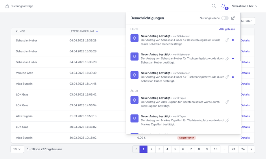 Sie können hier durch den Schalter im oberen Bereich auswählen, ob Sie nur ungelesene oder alle Benachrichtigungen anzeigen möchten. Durch Klicken auf die farbigen Punkte rechts neben den jeweiligen Benachrichtigungen bzw. durch die Auswahl "Alle gelesen" können Sie diese als gelesen markieren.