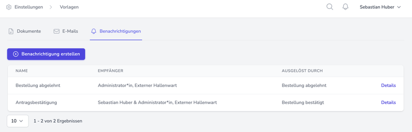 Um Benachrichtigungs-Vorlagen anzulegen, klickt man auf das Menü "Einstellungen - Vorlagen & Benachrichtigungen" und gelangt dann über den dritten Reiter "Benachrichtigungen" zur Übersicht der Benachrichtigungsvorlagen. Hier sieht man eine Liste der bereits erstellten Vorlagen. Dabei erkennt man direkt den Namen, die jeweiligen Empfänger und den verknüpften Auslöser. Es besteht hier die Möglichkeit, die Vorlagen über einen Klick auf "Details" anzusehen und auch anzupassen. Um neue Vorlagen zu erstellen klickt man auf "Benachrichtigung erstellen".