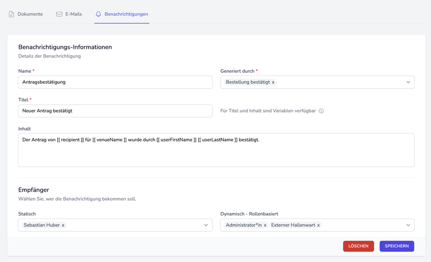 Um den Überblick im Venuzle Manager zu behalten, können Sie automatische Benachrichtigungen für bestimmte Abläufe und Aktionen im System einrichten. Ein Beispiel ist die Benachrichtigung des Hallenwartes bei einer neuen Buchung in seiner Sporthalle. Benachrichtigungen können in vielzähligen Anwendungsbereichen genutzt werden und erleichtern die interne Kommunikation.