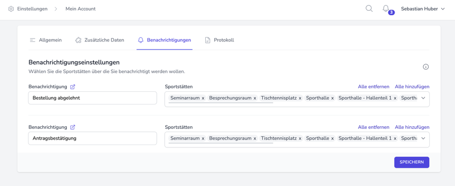 Nach dem Speichern der Benachrichtigungs-Vorlage, werden die verknüpften Benachrichtigungen nun auch im Profil des jeweiligen Personals angezeigt. Zugriff dazu bekommt man in Kontoeinstellungen des persönlichen Accounts unter dem Reiter "Benachrichtigungen". Hier werdend die verknüpften Benachrichtigungen angezeigt. Zusätzlich können im Sportstättenfeld einzelne Sportstätten abgewählt oder hinzugefügt werden, welche nicht der vorausgewählten, rollenbasierten Verknüpfung folgen.