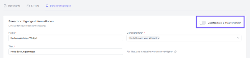 Um bei neuen Buchungsanfragen über das Widget in der Glocke benachrichtigt zu werden, müssen Sie ebenfalls eine neue Benachrichtigung erstellen und den Auslöser "Bestellungen vom Widget" auswählen. Wenn Empfänger*innen zusätzlich per E-Mail benachrichtigt werden sollen, muss der entpsrechende Schalter aktiviert werden. Bitte beachten Sie, dass bei allen im Widget buchbaren Sportstätten ein Preis hinterlegt sein muss, damit die Benachrichtigung funktioniert.