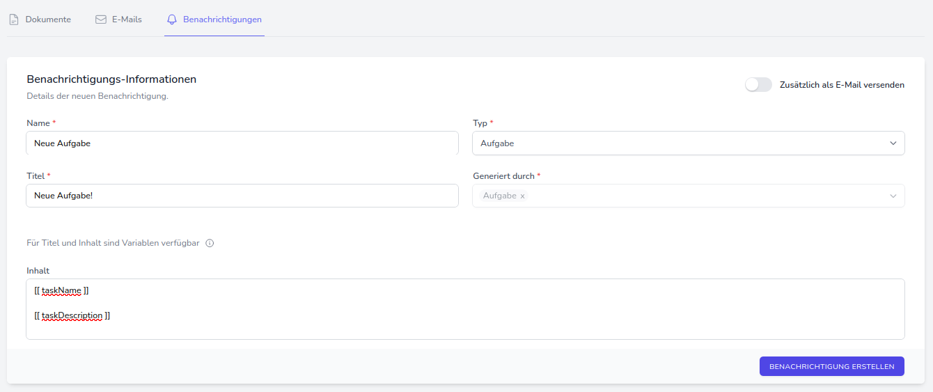 In der Erstellungsmaske können nun die einzelnen Eigenschaften und der Inhalt der Benachrichtigungs-Vorlage definiert werden. Hier werden Name, Titel, Inhalt sowie Auslöser ("Generiert durch") der Benachrichtigung gewählt. Für Titel und Inhalt können normaler Text oder auch Variablen verwendet werden.
