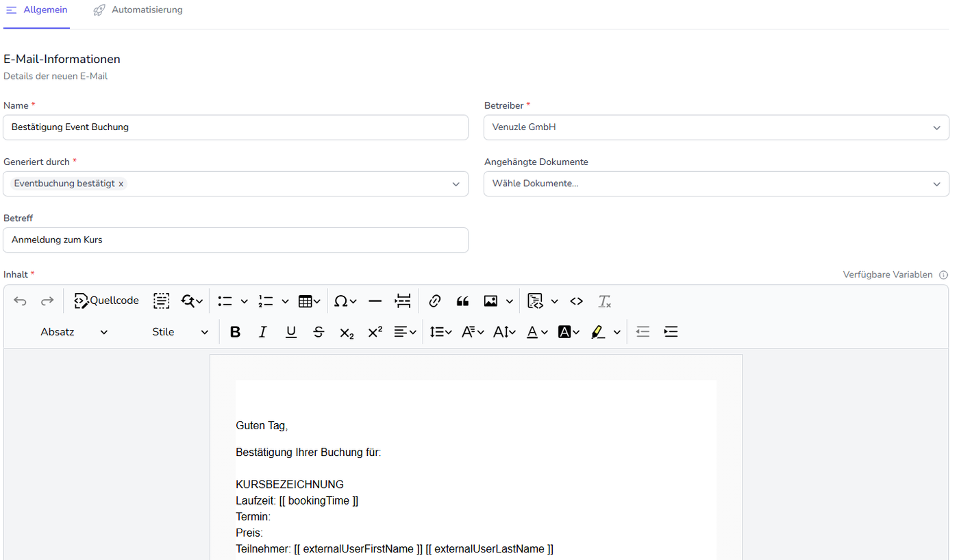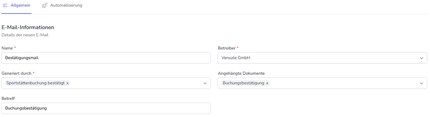 In folgendem Beispiel wurde eine E-Mailvorlage für eine Bestätigungsmail angelegt. Ausgelöst bzw. generiert werden soll diese, wenn eine Sportstättenbuchung bestätigt wurde. Als Anhang wird das Dokument “Buchungsbestätigung” angehängt, was weitere Details enthält. Weitere Informationen zu Dokumentvorlagen finden Sie hier.