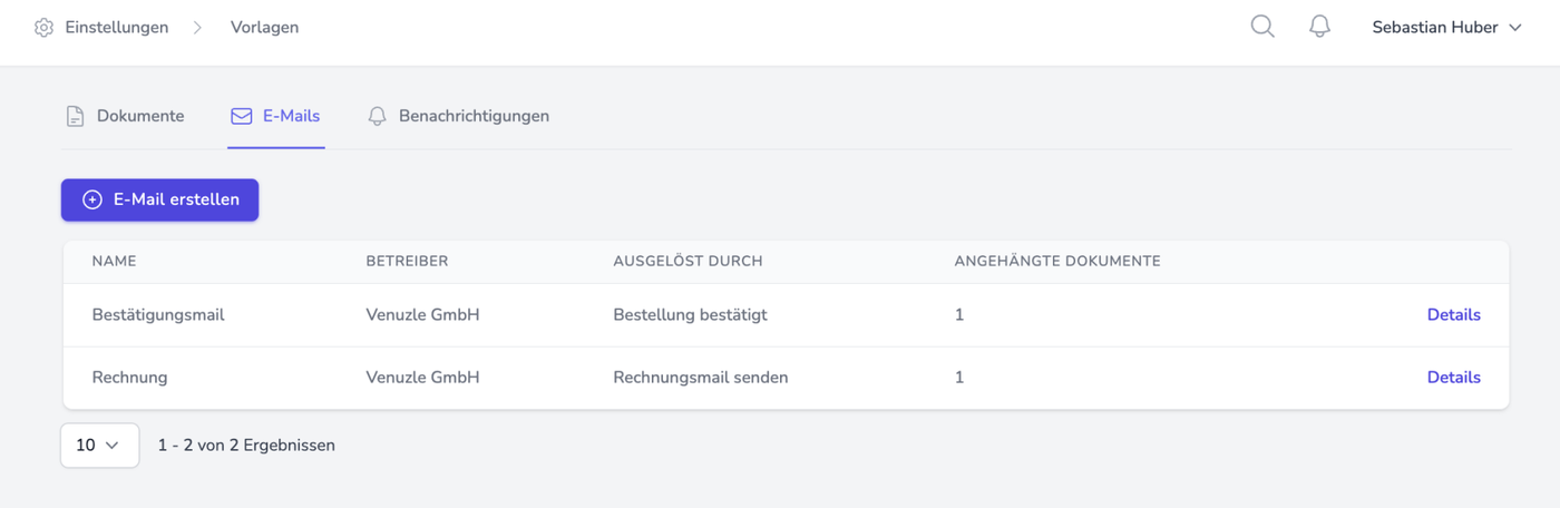 Navigieren Sie im Menü über Einstellungen > Vorlagen & Benachrichtigungen zum zweiten Reiter "E-Mails". Hier werden alle bereits erstellten Mail-Vorlagen aufgelistet.