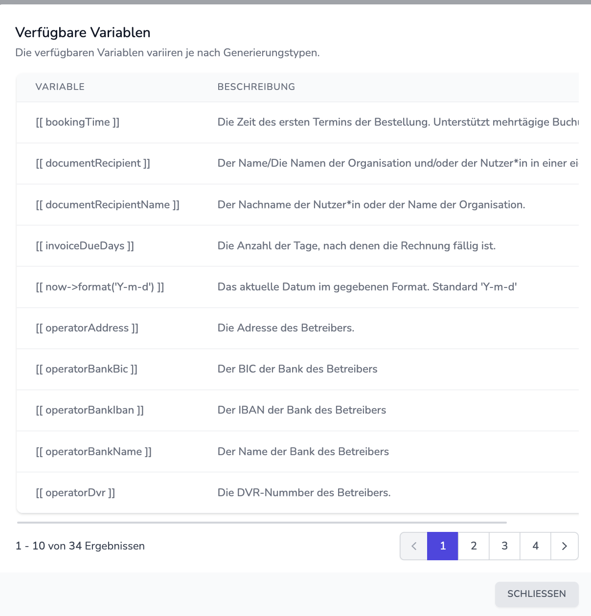 Um Teile des Inhalts automatisch generieren zu lassen, müssen bestimmte Varibalen im Text hinzugefügt werden. Ein Klick auf die Info "Verfügbare Variablen" gibt Auskunft welche Variablen im System zur Verfügung stehen.