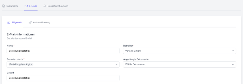 Der Name, die Betreiberzuordnung sowie der Auslöser sind Pflichtangaben. Zusätzlich können Dokumente ausgewählt werden, die beim Verwenden der Vorlage mitgesendet werden. Optional kann auch ein Betreff für die E-Mail ergänzt werden.