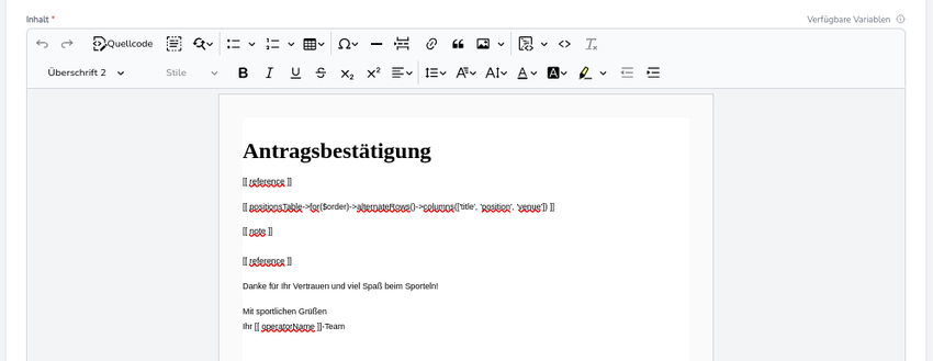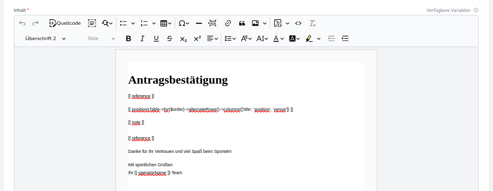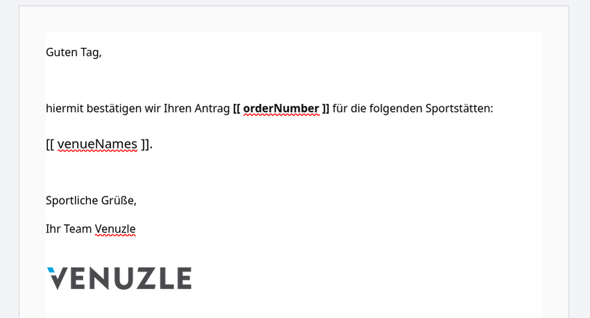In diesem Beispiel wird mit [[ orderNumber ]] die Bestellnummer generiert und mit [[ venueNames ]] die Namen die gebuchten Sportstätten der jeweiligen Bestellung.