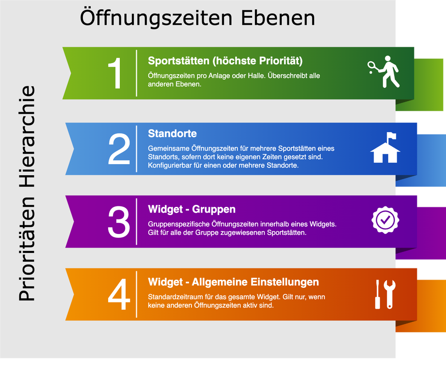 Öffnungszeiten, die auf einer detaillierteren Ebene (z. B. direkt bei einer Sportstätte) hinterlegt werden, überschreiben jene der übergeordneten Ebenen (z. B. Standort oder Widget).