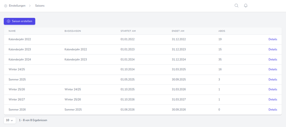 Unter "Einstellungen - Saisons" gelangt man zur Übersicht der Saison-Vorlagen. Hier werden der Name, die Basis-Saison, das Start- und Enddatum sowie die Anzahl der Abos angezeigt, welche die jeweilige Saison als Vorlage verwenden. Zusätzlich kann man sich Details zu den bestehenden Saisons anzeigen lassen oder diese gegebenenfalls bearbeiten. Die Anpassung von zeitlichen Daten ist jedoch nur möglich, wenn noch keine Abos auf die Vorlage zurückgreifen.