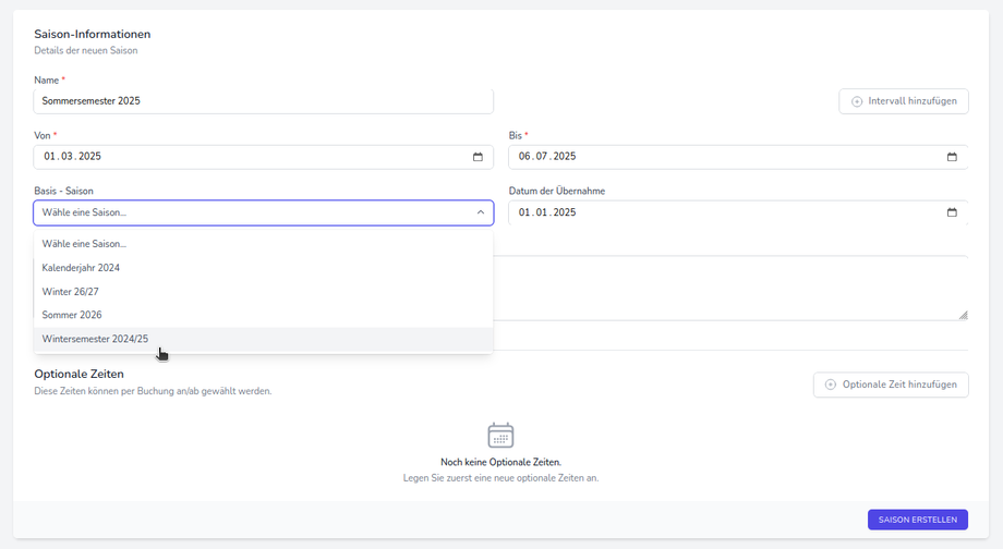 Per Klick auf "Saison erstellen" kann eine neue Saison angelegt werden.