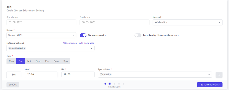 Beim Erstellen einer neuen Saison muss zuerst der Name und der Zeitraum der Saison ausgewählt werden. Der Zeitraum kann dabei auch aus mehreren unterbrochenen Intervallen bestehen, welche über den Button "Intervall hinzufügen" ergänzt werden können.