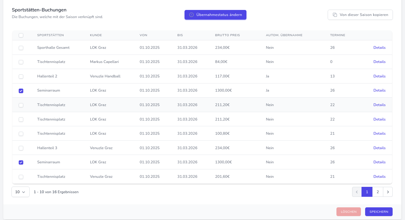 In dieser Übersicht ist auch der Status der automatischen Übernahme einer Buchung in die Folgesaison ersichtlich. Dieser kann durch das Auswählen der betreffenden Buchungen und anschließendem Klick auf den Button "Übernahmestatus ändern" geändert werden.