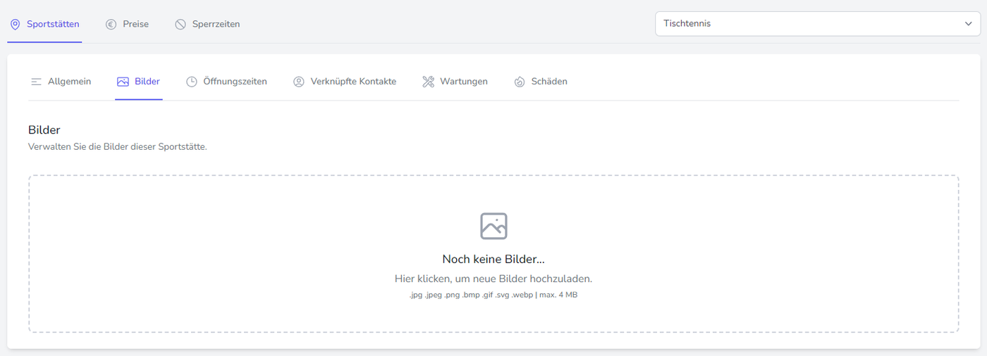 Dort wählen Sie den Reiter "Bilder" und klicken ins linierte Feld um Fotos hochzuladen. Nachdem Sie darauf geklickt haben, wählen Sie das Bild auf Ihrem Computer/Mobilgerät aus und fügen dies zur Sportstätte hinzu. Klicken Sie zum Schluss dann auch noch unbedingt auf "Speichern" um den Upload abzuschließen.
