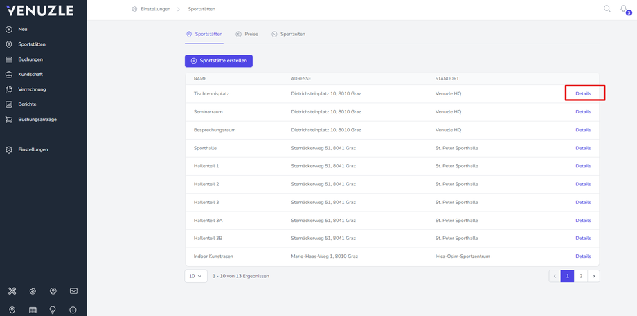 Wählen Sie hierfür unter Einstellungen - Sportstätten und klicken neben der gewünschten Sportstätten auf "Details".
