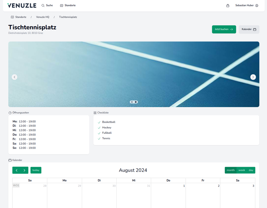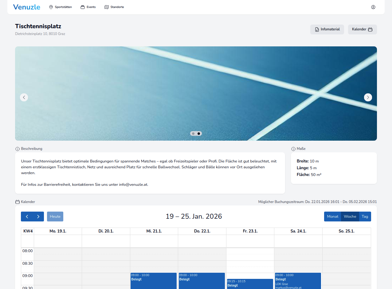 Per Klick findet man alle Details (Öffnungszeiten, Inventar, ...) sowie eine Kalenderansicht, die einen Überblick über alle freien und belegten Termine zur jeweiligen Sportstätte bietet.