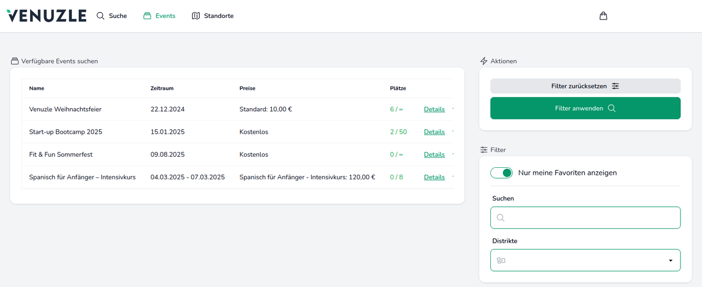 Sofern Sie diese Funktion aktiviert haben, erhalten externe Nutzer*innen hier auch einen Überblick über die buchbaren Events. Auch für Events gibt es eine Such-, Speicher- und Filterfunktion.