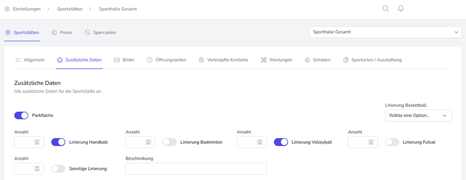 Sportstätten: Hier wurden Zusatzfelder hinterlegt, die anzeigen, ob die Halle für bestimmte Sportarten geeignet ist. Als Typen wurden dabei Dropdown, Schalter, Nummer und Text gewählt.