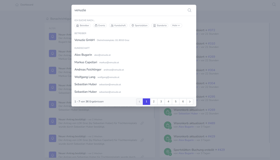 Über die Lupe am rechten oberen Bildrand können eine Vielzahl von Daten gesucht und gefunden werden. Dafür klickt man die Lupe einfach an und gibt einen Suchbegriff ein. Nachdem man den Begriff eingegeben hat erscheinen alle gefundenen Daten: