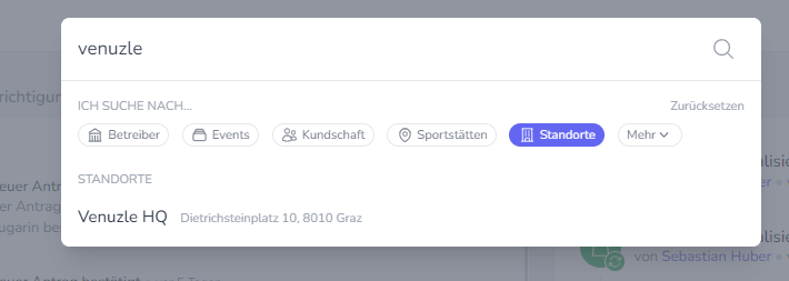 Um die Vielzahl der Ergebnisse zu begrenzen kann man den dementsprechenden Filter unter "Ich suche nach" auswählen. Hier wird die Suche beispielsweise auf Standorte eingeschränkt.