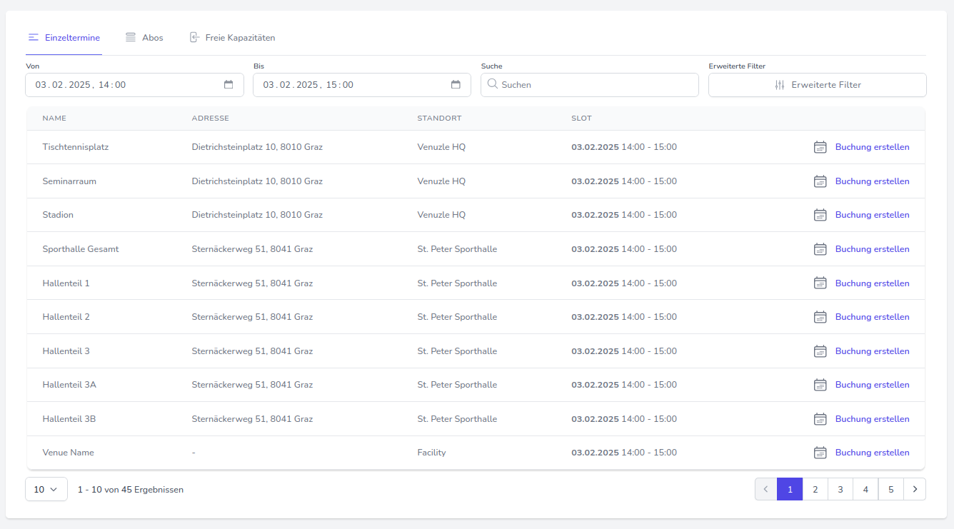 Die Suche nach verfügbaren Sportstätten wurde speziell für Venuzle Partner mit einer Vielzahl von zu verwaltenden Sportflächen entwickelt und erleichtert durch Eingrenzungen und Filter den Buchungsprozess.