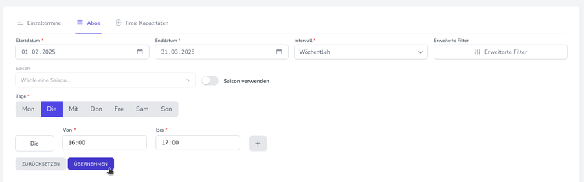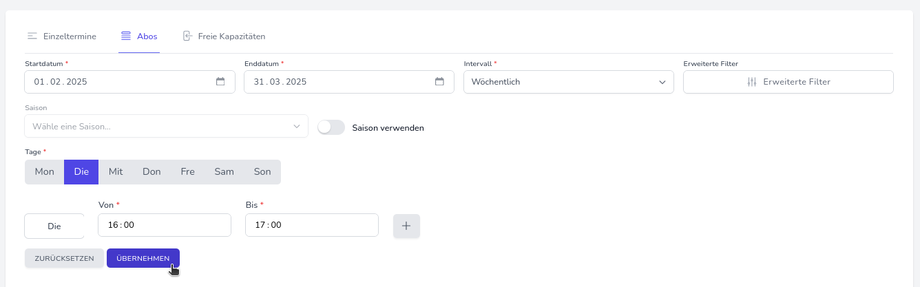 Wenn Sie verfügbare Sportstätten für Abotermine suchen möchten, gehen Sie genau so vor. Zusätzlich können Sie hier aber auch Intervall, Saison und Wochentage angeben.