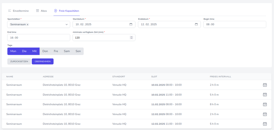 Um freie Kapazitäten für eine oder mehrere bestimmte Sportstätten zu finden, wählen Sie diese aus und tragen das Datum ein, für das Sie suchen möchten. Zusätzlich muss die geplante Mindestbelegungszeit in Minuten angegeben werden. Es können außerdem einzelne Wochentage und Uhrzeiten für die Suche festgelegt werden.