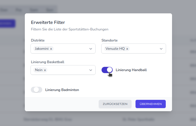 Wir empfehlen daher, die Suche mittels erweiterter Suchfilter noch weiter einzugrenzen. Wenn Sie beispielsweise wissen, dass der Verein, für den gebucht werden soll, Handball spielen möchte, können Sie einen Filter "Linierung Handball" erstellen und aktivieren.