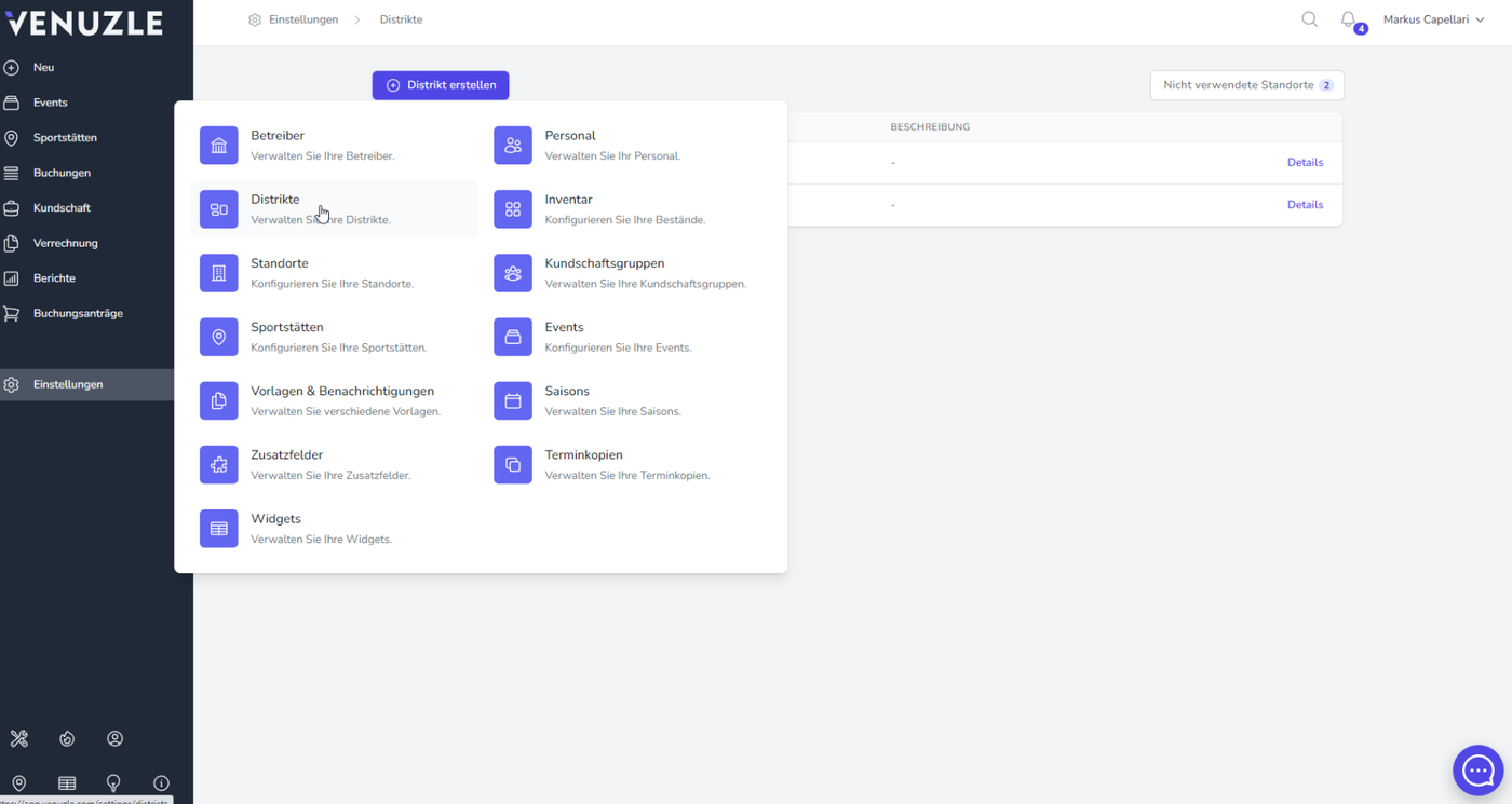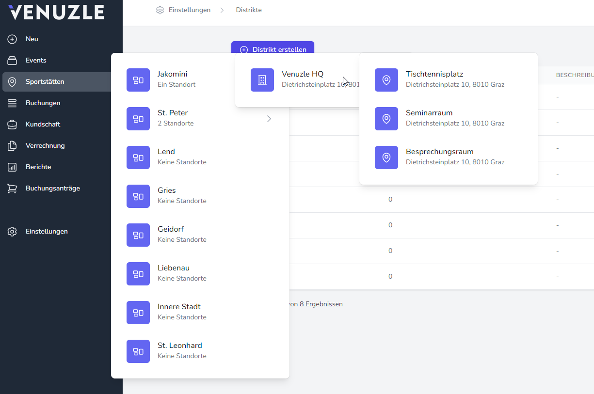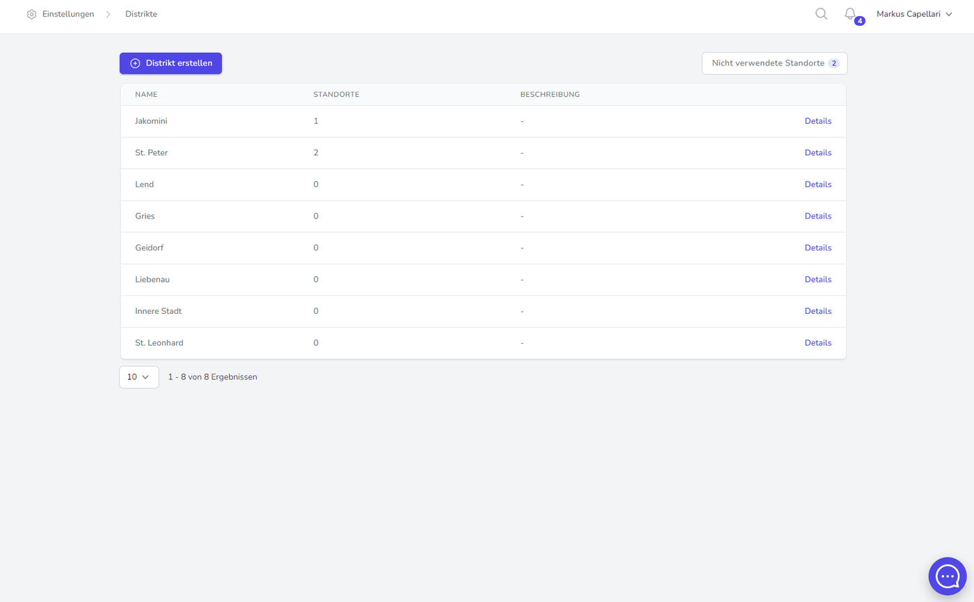 Unseren Großkunden bieten wir die Möglichkeit eine Ebene zur Gliederung der Standorte einzufügen. Über Einstellungen - Distrikte können Sie hier beliebig viele Unterteilungen angelegen. Das Wort "Distrikte" fungiert hier als Platzhalter und kann für Sie gerne umbenannt werden. Geben Sie dafür einfach Ihrem Venuzle Ansprechpartner Bescheid. Mehr Infos dazu finden Sie auch unter: Anpassung der angezeigten Begriffe (Wording)