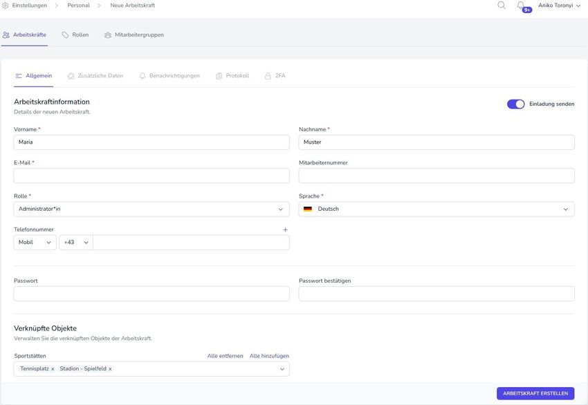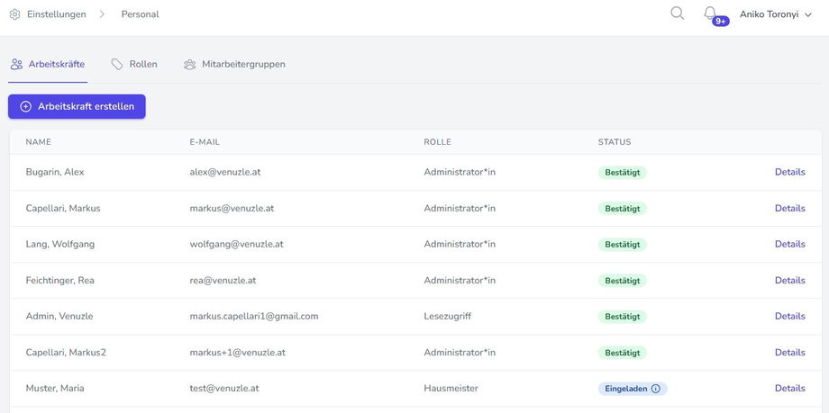 Wenn Sie Ihre Kolleginnen und Kollegen ebenfalls Zugang zum Venuzle Manager erhalten sollen, können Sie dies im Menü unter Einstellungen - Personal veranlassen. Mit Klick auf "Neue Arbeitskraft anlegen" können Sie einen neuen Personalaccount anlegen und so für weitere Nutzer*innen einen Zugang zum Manager schaffen.