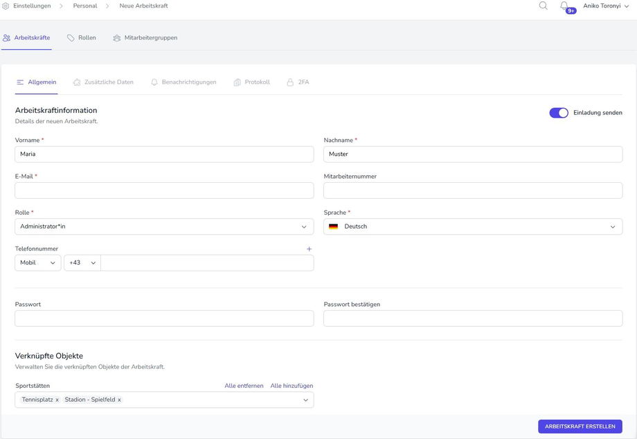 Weiters können im Bereich "Verknüpfte Objekte" Sportstätten/Ressourcen mit der Arbeitskraft verknüpft werden, was in weiterer Folge vor allem für die Automatisierung der Informationweitergabe (z.B. über Benachrichtigungen) eine Rolle spielt. Die Verknüpfung hat dabei keine Auswirkung auf die Berechtigungen der Arbeitskraft in Hinblick auf die verknüpfte Sportstätte. Berechtigungen werden ausschließlich über die ausgewählte Rolle zugeteilt.